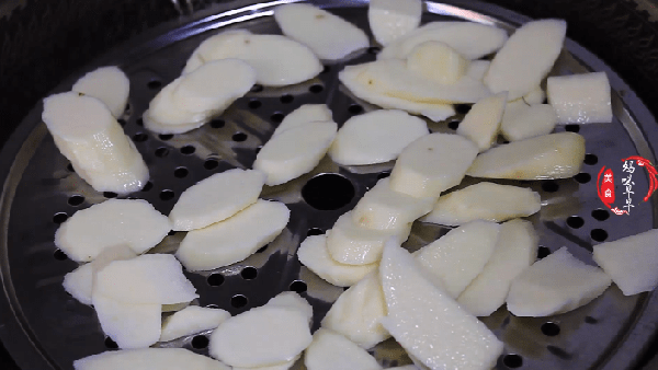 4,锅里再烧点水把山药烫一下,这样去皮的时候就不用担心手痒了,将山药去皮后切成薄片,放入蒸屉上,这样蒸的时候能把多余水分过滤掉,盖上锅盖蒸熟。