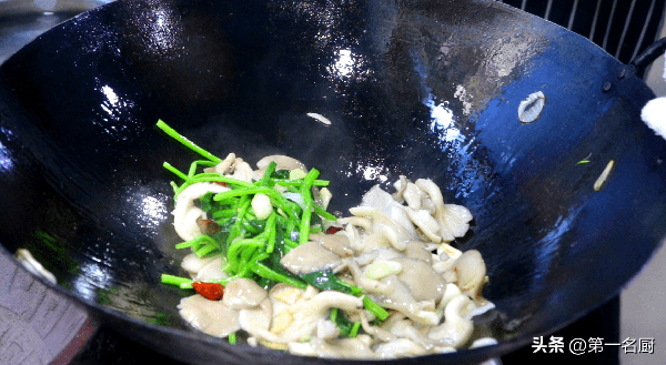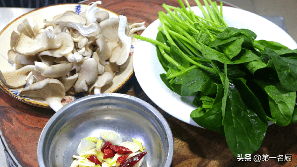 2、另起锅加少许食用油,放入葱姜蒜和红干椒爆香,下入平菇和菠菜,翻炒片刻,起锅撤火开始调味。