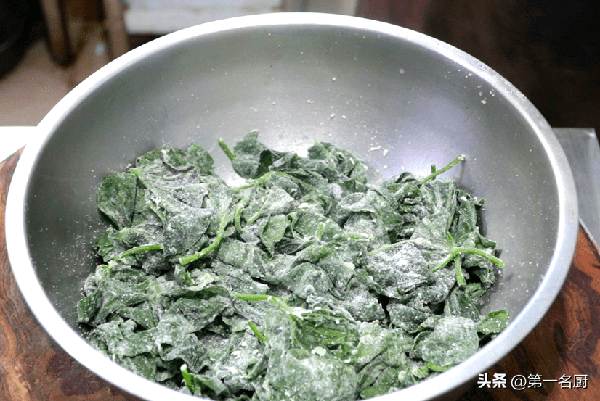 2.锅里面烧水,放上篦子,开大火把水烧开,把控水后的红薯叶倒入盆中,先淋上少许的植物油,用手拌匀,然后加入适量面粉,用手拌匀,保持干燥状。