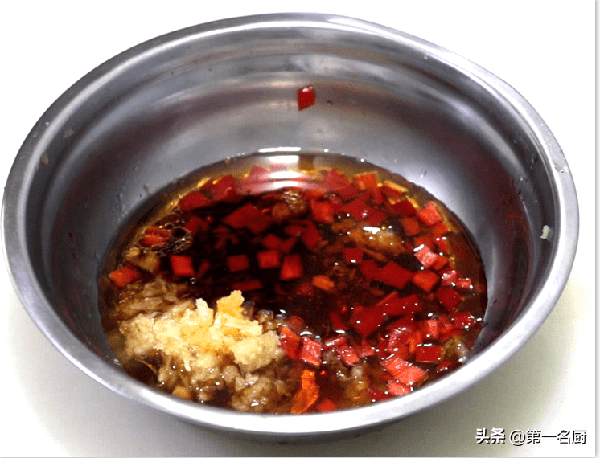 4.下面准备一下蘸料汁,蒜臼子里面放入几粒蒜子,捣成蒜泥放入盆中,小米椒一个切成小片,和蒜末放在一起,加入芝麻油3克,陈醋5克,红油5克,生抽3克,用筷子搅拌均匀,化开调料。