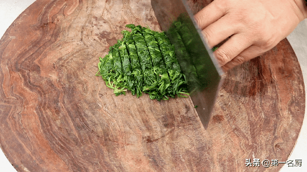 2.水开后,下入荠菜,焯烫十来秒,荠菜颜色返青即可捞出,放入漏勺中挤干水分,放在案板上用刀切碎。