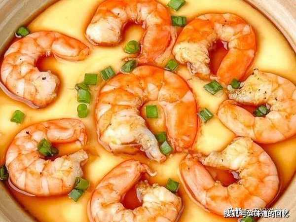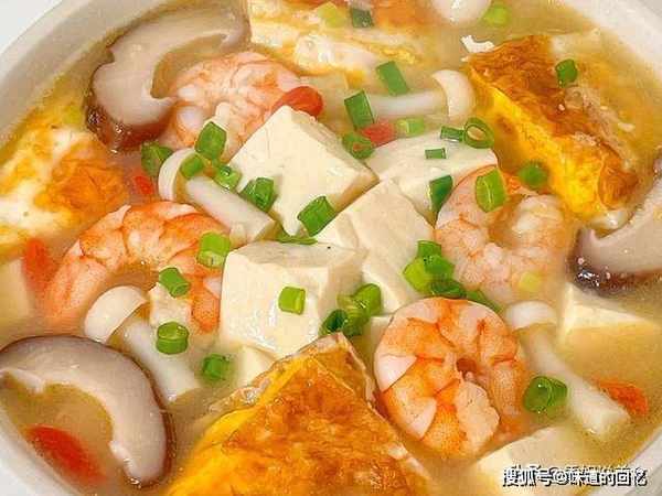 虾仁,鸡蛋,白玉菇,香菇,水豆腐,枸杞子,葱花。