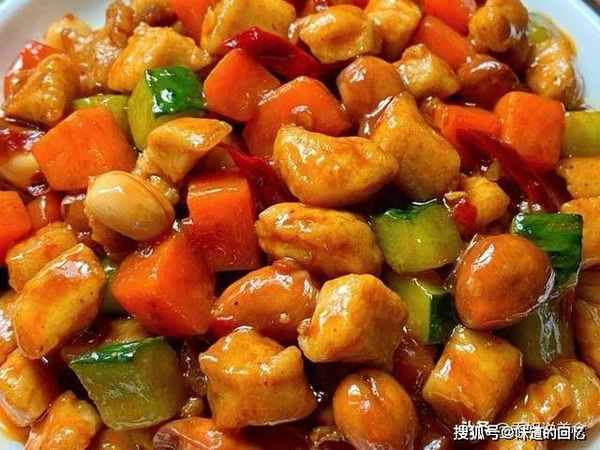 5、接着放入胡萝卜丁翻炒20秒,再放入鸡胸肉、黄瓜丁和炸过的花生米,翻炒均匀。