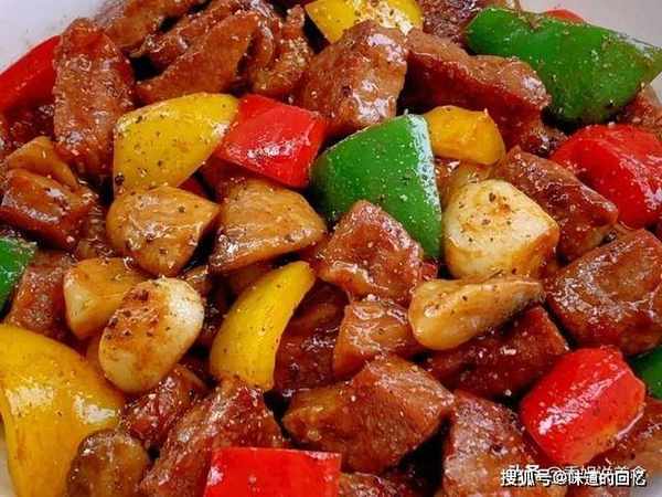 4、放入口蘑、彩椒,翻炒一分钟左右,炒熟所有食材。再放入蚝油调味,撒上黑胡椒粉,翻炒均匀即可出锅装盘开吃。