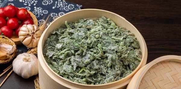 将红薯叶洗净,控水放入盆中,然后在红薯叶上均匀铺上一层面粉,放入蒸锅中,盖上锅盖大火蒸20分钟,盖上盖子.然后把红薯叶做成蒜泥放在碗里,淋上鲜酱油,撒上香油,待红薯叶冷却后,将蒜泥蘸上蒜泥就可以了。