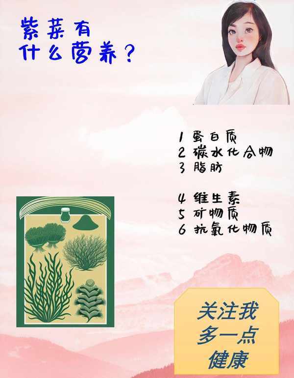 1. 蛋白质:紫菜含有高质量的蛋白质,其中包括多种必需氨基酸,有助于维持身体的健康。