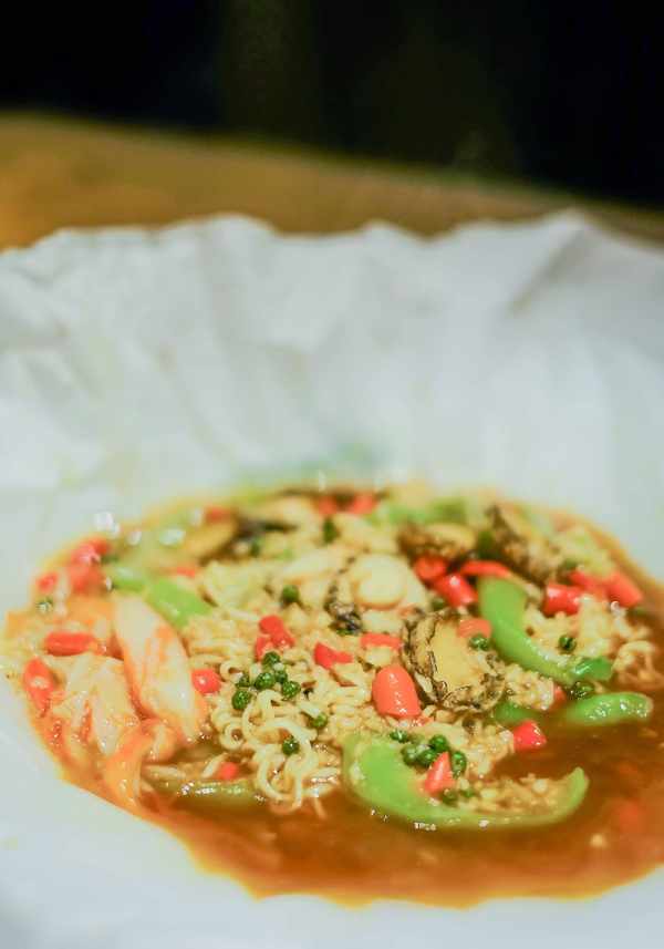 然后第二盘鲍鱼在纸上烤制。听说过很多次,就是没吃过。鲍鱼和面条的完美结合,鲍鱼蒜蓉炒的很香,蒜蓉拌入鲍鱼肉里,面条裹着鲍鱼汁,每一口都是幸福。咬一口新鲜的丝瓜,整道菜又有了升华。