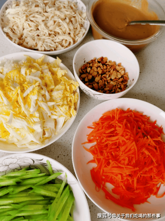 1、黄瓜、胡萝卜洗干净后切丝,娃娃菜洗干净后切丝。冷锅冷油放入花生米,小火炒熟后放凉并去皮,用擀面杖擀成花生碎。鸡胸肉冷水下锅,加入葱姜、八角、香叶、花椒、食盐,煮开后小火煮10分钟,捞出晾凉,撕成鸡丝。