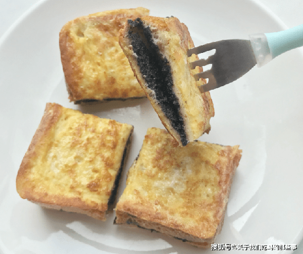 1、一片吐司片放入盘中,抹上一些黑芝麻酱,再盖上一片吐司。盘子里打一个鸡蛋,搅拌均匀后放入处理好的吐司片,裹上一层鸡蛋液。