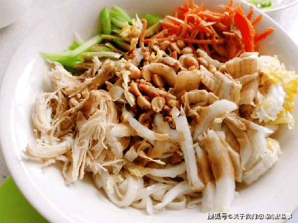 3、挂面放入碗中,放上鸡丝、黄瓜丝、胡萝卜丝、娃娃菜丝,撒上一勺花生碎,倒入碗里的芝麻酱汁,用筷子翻拌即可食用。