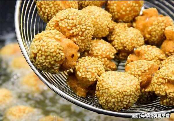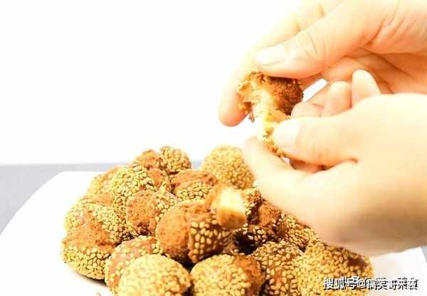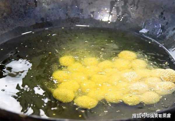 小技巧:团小丸子的时候,手上要粘水,若是手上不粘水,芝麻一进油锅全部会掉落