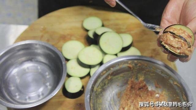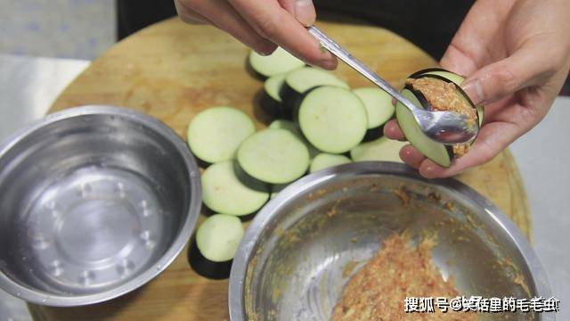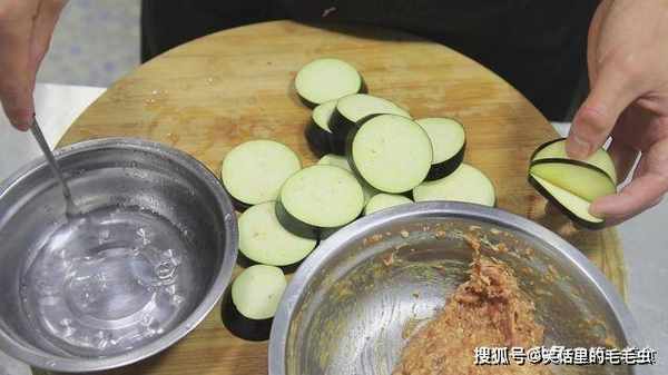 把茄子一块一块切好以后,取出肉馅,把肉馅旁边准备一小盆清水。