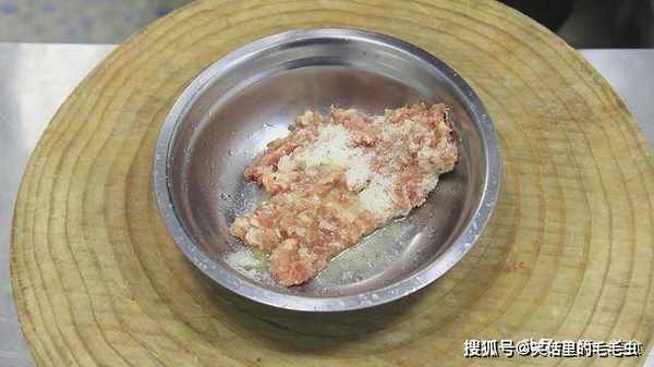 把肉末剁碎后,放在盆中。加入