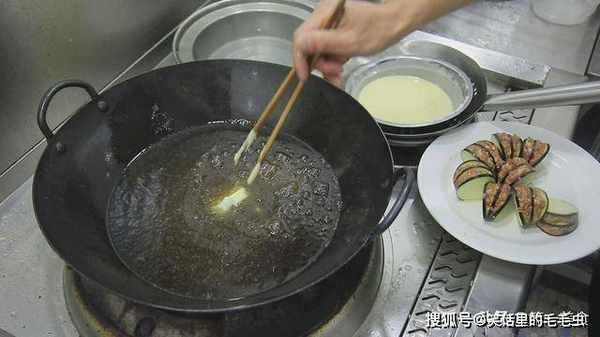 锅内烧油,油烧至5成热,油面微微的冒烟,用筷子夹起茄夹,挂满面糊。