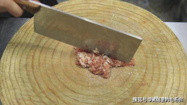 首先取瘦肉一块,先切成薄片,再剁成肉末。(自己剁出来的肉末更有筋性有嚼劲)