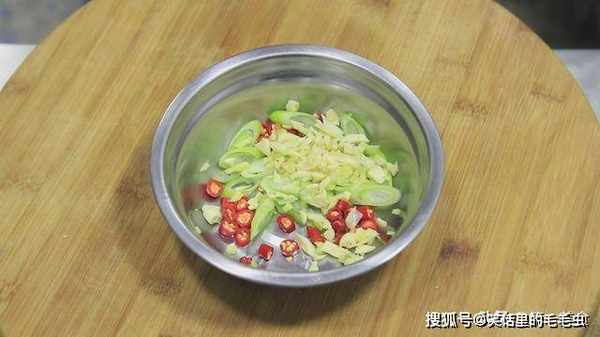 接下来准备一些小料,小米椒几粒切成辣椒圈,大葱白一小段切成马蹄片,生姜一小块切成姜末,大蒜几粒拍扁以后切碎,放在一个小盆中。