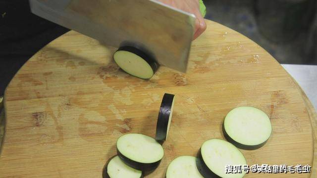 利用这个时间,我们把茄子切一下,去掉茄子的尾部,像视频中一样下刀。
