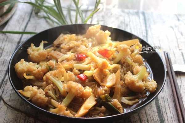 菜花燉粉條做法:1,花菜用淡鹽水浸泡十分鐘以上,撈出沖洗乾淨,然後劈成小塊。2,鍋裏放入花生油,燒熱,放入葱,薑,花椒爆香。3,倒入處理好的菜花,煸炒幾下,然後倒入幾滴醬油和一勺生抽烹一下。4,加入一碗水,把把清洗好的紅薯粉條放入鍋裏,蓋上蓋子燜一會,加入少許的鹽調味炒勻即成。