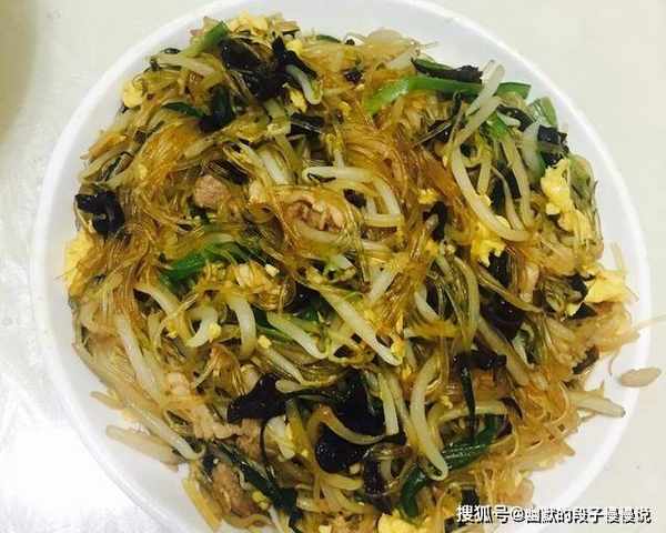3、热锅加油 韭菜白先入锅 爆香 入黑木耳和五花肉 到五花肉变白 倒入豆芽和粉丝 蛋散 加生抽 白糖 和蚝油 迅速颠锅 尽量抖匀 让粉丝均匀上色,起锅。