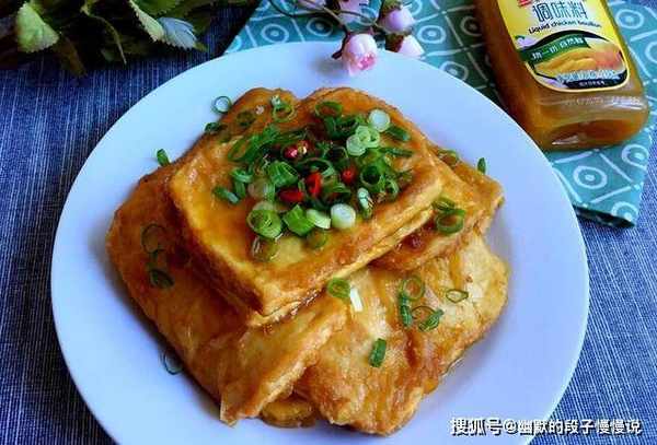 4、另起锅加少许油,花椒面和葱花爆锅,加少许生抽,加100ml水,加盐,鸡精,胡椒粉,倒入煎好的豆腐,小火炖煮五分钟,淋淀粉水勾芡出锅。