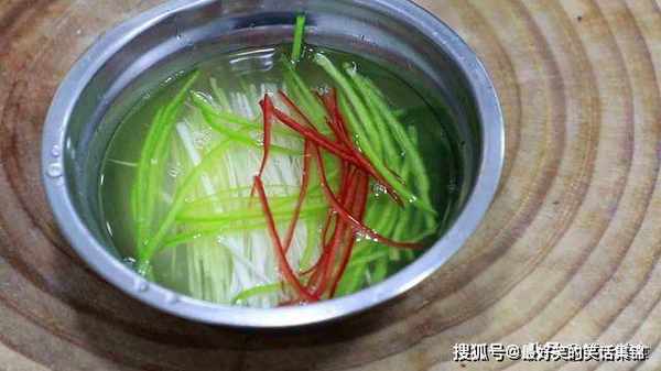 4.准备生姜一块,切成姜丝,葱白一段,剥掉硬芯,切成细丝,青椒半个去籽后也切成细丝,红椒半个切成细丝,全部放在一起,加入清水浸泡10分钟,去除葱姜的辛辣味和青红椒的浮色。
