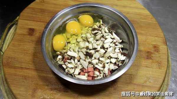 3.和切好的火腿肠放在一起,打入三个鸡蛋,用筷子搅拌均匀。