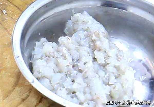 1.准备大虾200克,在虾背的第三节处用牙签将虾线挑出来,剥去虾头和虾壳,把虾肉放在盆中清洗干净,剁成碎粒备用。切点葱末备用。