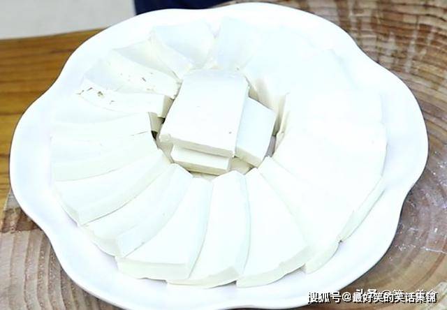 1.准备嫩豆腐两块,切成一厘米左右的厚片,做这道菜用嫩豆腐、老豆腐都可以。切好以后绕着盘子摆一圈,剩余的放在中间,这样摆盘,成菜更加的美观,能够增加食欲。