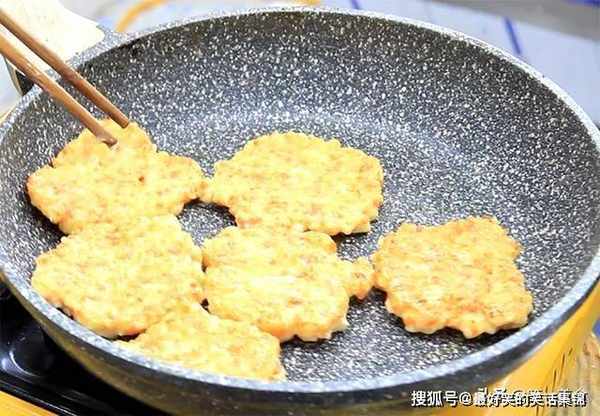 4.在平底锅内烧油,油热后用勺子把虾馅按压成一个个薄厚均匀的小饼,依次放在锅中,开小火慢慢煎,一面煎黄以后翻过来煎另一面,等到虾饼煎至两面金黄即可出锅。