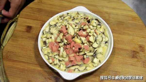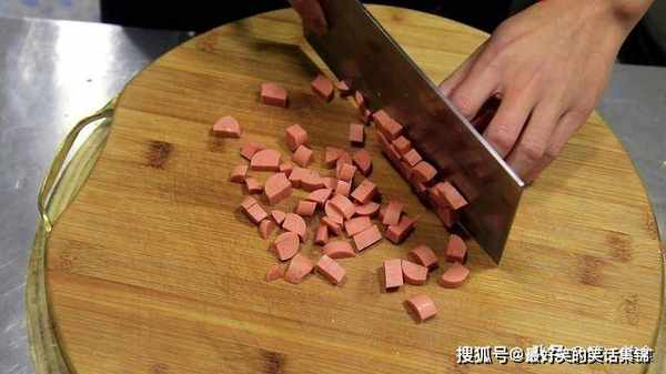 1.准备火腿肠两根,用刀切成长条,再切成颗粒,放入盆中备用。
