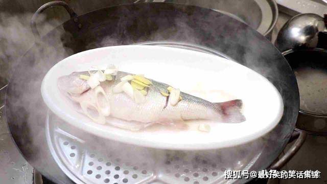 3.锅内烧水,放上篦子,大火把水烧开,把腌好的鲈鱼放入盘中,撒上葱姜,浇上腌鱼的料汁,放入锅中蒸8分钟。