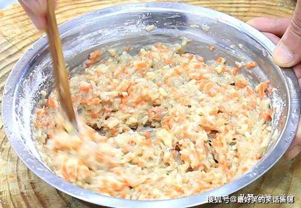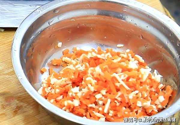 2.切点胡萝卜丝、杏鲍菇丝放入锅内,焯水1分钟左右,倒出来用凉水快速冲洗,挤出胡萝卜丝、杏鲍菇中的水分,再剁成碎末放在盆中备用。