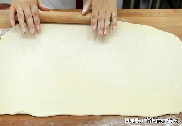 3.1个小时以后,我们扒开面团看一下,里面都是蜂窝眼,说明面团已经发酵好了。在案板上撒一层面粉,把面团拿出来揉一揉排排气,面团揉光滑以后,用手压扁,擀成长方形的面饼。