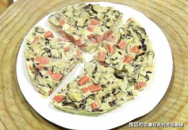 7.7分钟以后已经蒸熟,把三色蒸蛋取出,另外准备一个盘子扣在上面,去掉保鲜膜,放在案板上,用刀切成大小均等的三角块,再放入盘中即可食用,放上少许葱花即可食用。