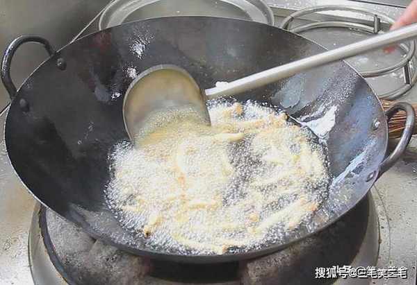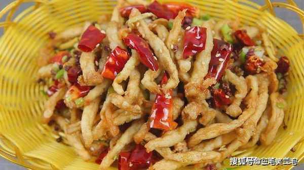 时倒入白玉菇,小火炸一分钟,炸出白玉菇的水分,倒出白玉菇控油。