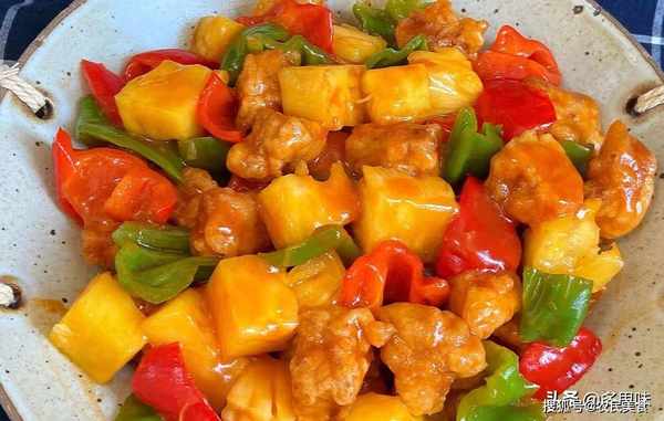 3、锅中放油,加青红椒翻炒一会,加入调料汁煮成浓稠,加入里脊肉和菠萝裹上汁就可以了
