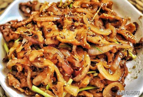 3、炒锅留少许底油,放入洋葱丝煸炒出香味,放入盐1小勺,蚝油1小勺翻炒均匀,接着倒入肉片继续翻炒一下,撒入适量孜然粒和白芝麻翻炒均匀后,撒入葱丝拌匀出锅。