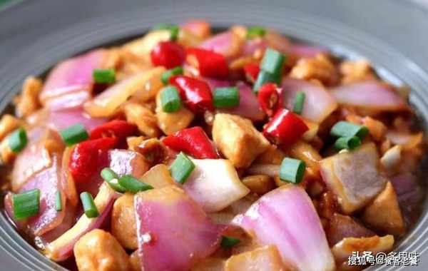 5、起锅,倒入洋葱块翻炒出香味,然后倒入鸡丁和调制好的酱汁一起翻炒均匀,大火收汁即可出锅。