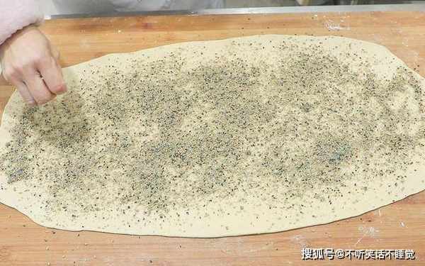 在案板上面撒上一点干面粉,把面团搓揉排气揉成一个圆圆的面剂子,取一个大的擀面杖把圆面剂先擀成一个椭圆形,再慢慢修整成一个长方形,擀好以后把准备好的芝麻盐均匀地撒在面皮上面,再用擀面杖擀实。