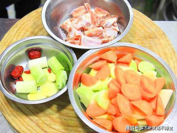 准备一斤新鲜的猪排,剁成均匀小块,放入清水中抓洗出里面的血水,控干水分备用;准备青萝卜、胡萝卜各一个,去皮之后切成均匀的滚刀块;切点姜片、葱段放入碗中,再加入几粒枸杞和红枣,增加汤的营养。