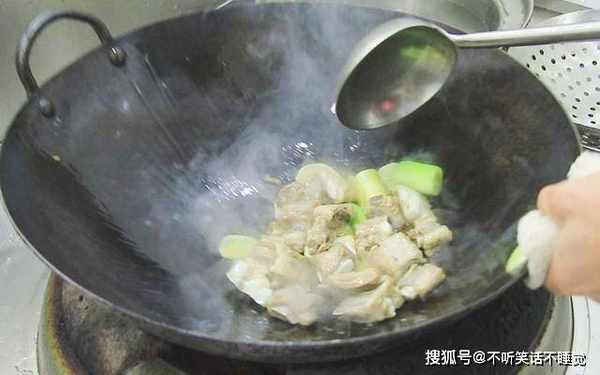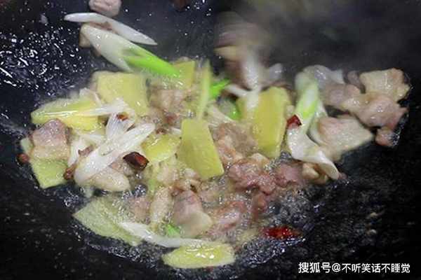 锅里烧油,充分滑锅以后倒出热油、加入凉油,这样炒菜的时候不粘,把肉片倒进去煸炒,煸出猪油成菜更香,然后放入葱姜等小块,一起炒出香味。