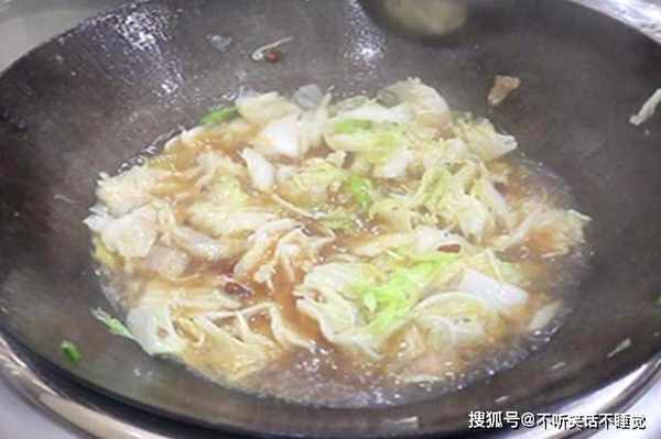 接着放入白菜帮,淋点料酒去腥,大火把白菜帮炒断生再放白菜叶,一块炒的话容易大量出水、影响口感,分开下锅既能保证成熟度、又能保证口感。