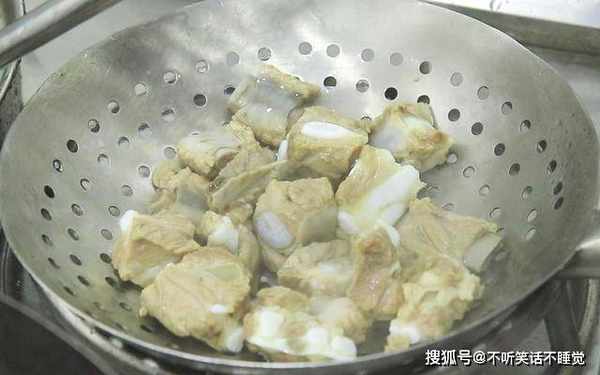锅内加入水,排骨冷水下锅,加入少许食盐,倒入一点料酒去腥,水烧开以后把锅中的浮沫打干净,煮至没有杂质溢出把排骨捞出,用清水冲洗干净,控水备用,这一步主要是为了去除排骨中的血水,达到去腥的效果。