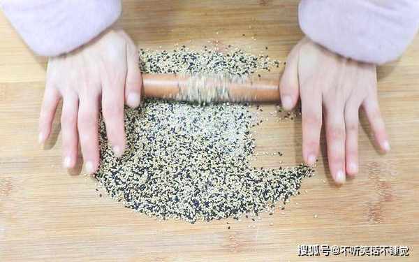 锅内放入2勺白芝麻、1勺黑芝麻,芝麻要在锅凉的时候放入,用木铲把芝麻在铺平,炒芝麻时要勤翻动,把芝麻炒至变色立马关火,然后把炒好的芝麻放在案板上面,加入食盐3克、椒盐1克,然后把芝麻用擀面杖擀碎,把芝麻擀成碎末以后放在碗中备用。