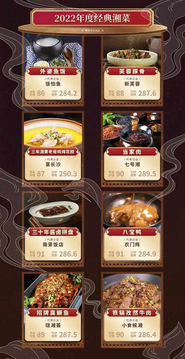 从2020年的开幕启航,到2021年湘菜之光,再到今年“年度湘菜预制菜”的重磅升级,年度湘菜在不断丰满,更具分量,影响力越来越强。经过对2022年湖南整体餐饮市场进行统计分析,从销售量、技术指数、流行趋势、好评率等方面综合考量,共计评选出6道2022年度湘菜,8道2022年度经典湘菜,以及6道年度湘菜预制菜。
