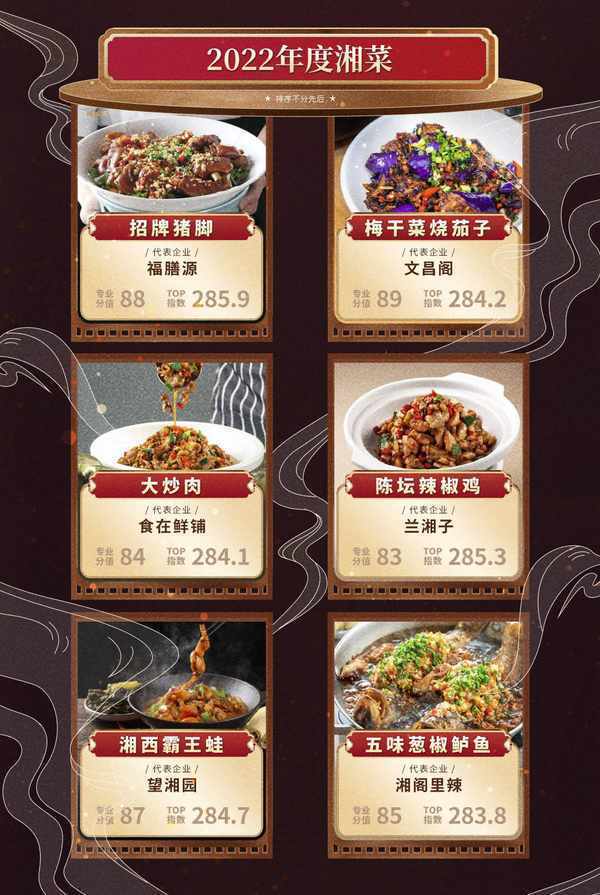 回首2022年,湘菜的发展起起伏伏,但依然有无数优秀的湘菜作品涌现,为湘菜行业的发展增添了不少星光。20道爆款湘菜,是受到市场的认可与欢迎、最能够代表当下潮流的湘菜菜品,是名副其实的“年度湘菜”。