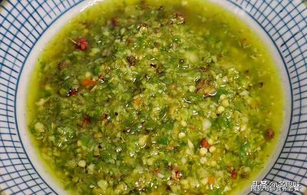 3、锅里热油,加入一小把青麻椒(根据口味来),然后倒入辣椒碎,小火煸炒到油变绿,加入3匙盐调味就好啦