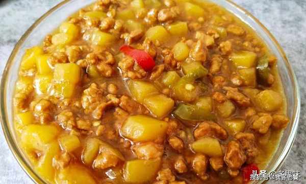 2、炒锅放油烧热,倒入肉末煸炒均匀,倒入土豆丁翻炒均匀,放小米椒,生抽2勺,老抽1勺,蚝油1勺,盐少许,白糖一点点翻炒均匀,加两碗清水,小火焖至汤汁收浓,淋入少许水淀粉勾芡即可出锅,好吃的拌饭酱就做好啦,用了拌面条也特别棒哦。