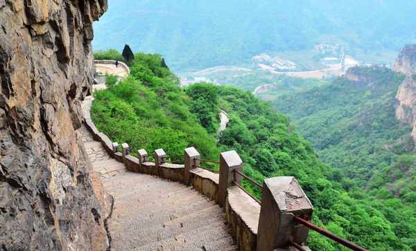风景区山体由于受到时间和地壳运动的侵蚀变化,在岩石层的推动下,变成了典型的崖栈地貌,放眼望去陡壁成崖,崖顶石阶险而窄;从顶上往下悬望下望,仿佛置身于山半仙境之境界,沿绝壁西侧节理裂隙开凿的登山“天梯”,可以称得上是险境。