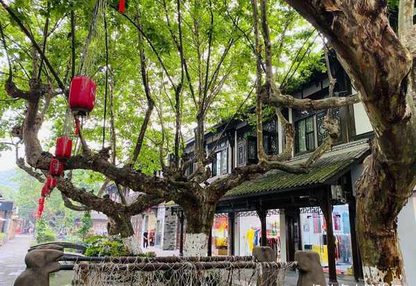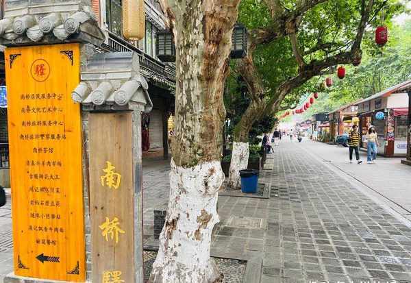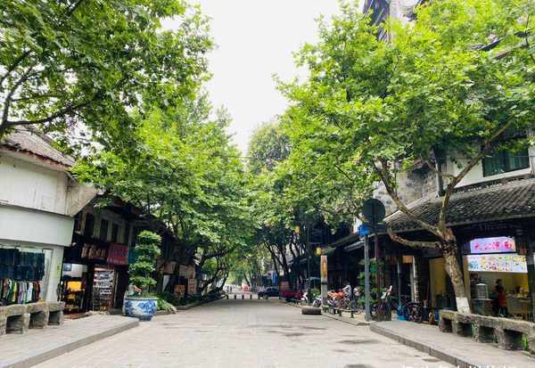 在道路两旁种植有两排高大的梧桐树,树叶很宽大,每一棵树都很具有历史,走入其中,阳光透过缝隙照射下来,让人不会感到特别热,试想一下,如果没有这些树木的承托,行走在街道上的人们是怎样一个心情,那种汗流浃背的感觉不是滋味的,所以这也是有别于城市步行街的好处。
